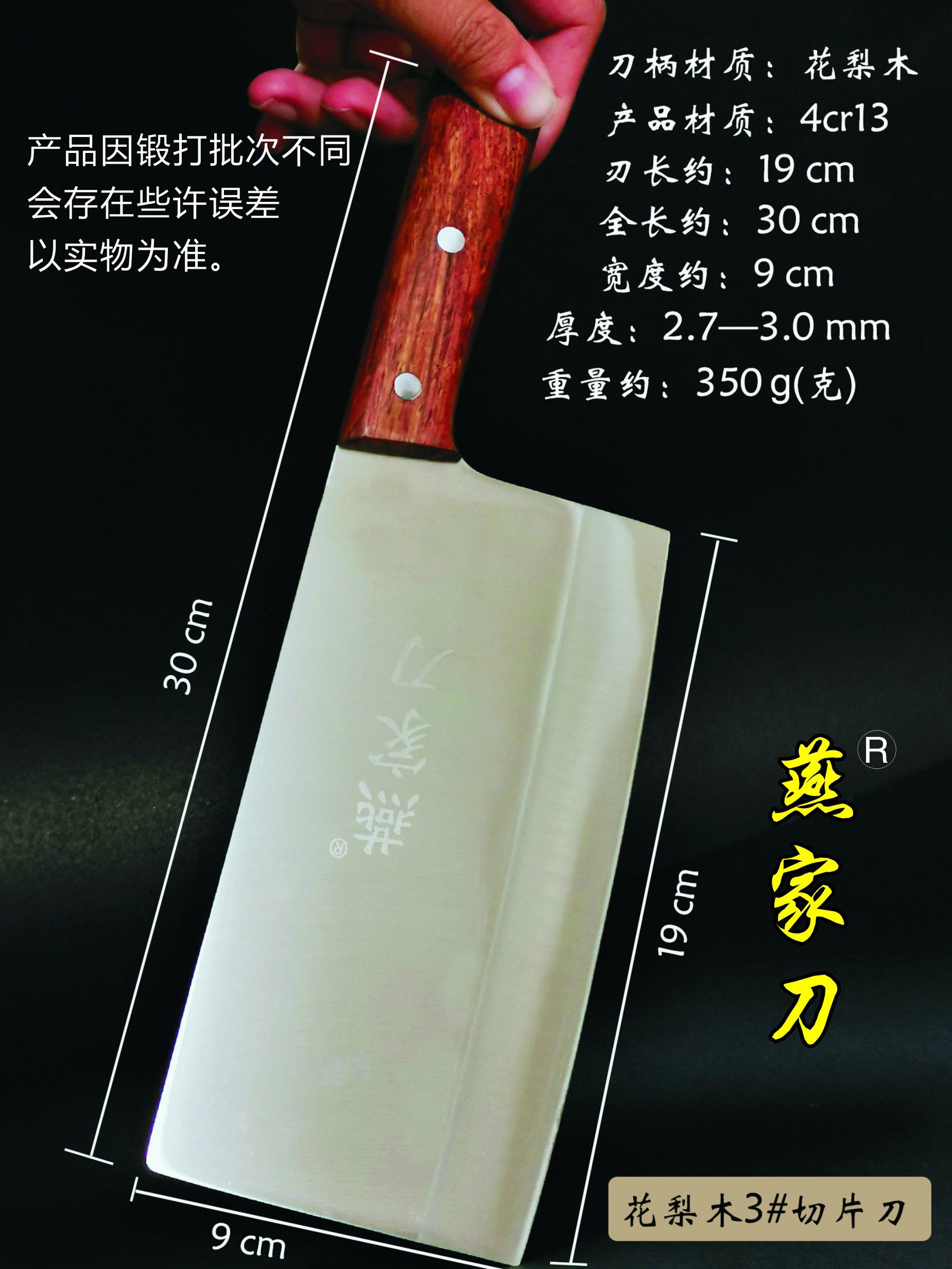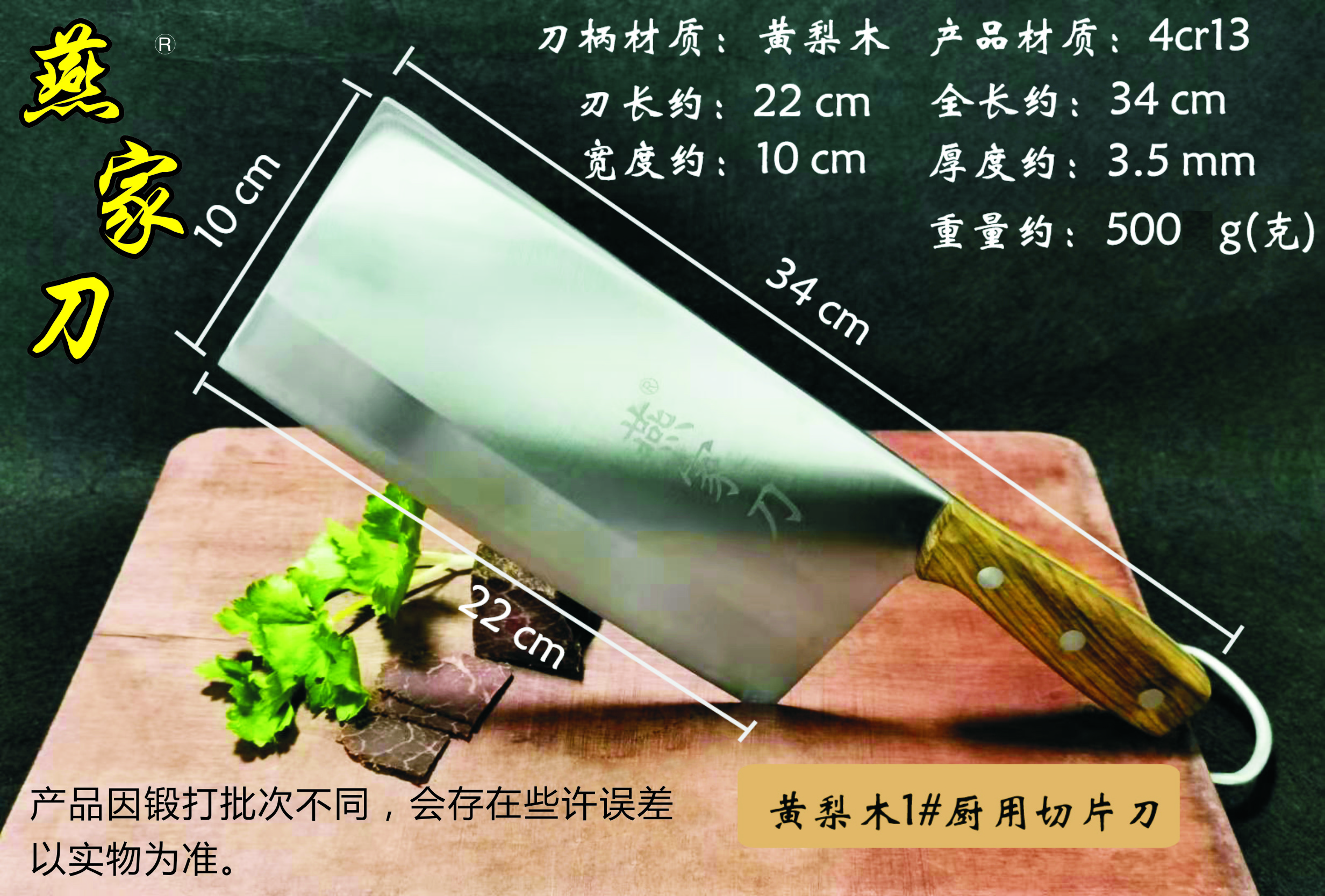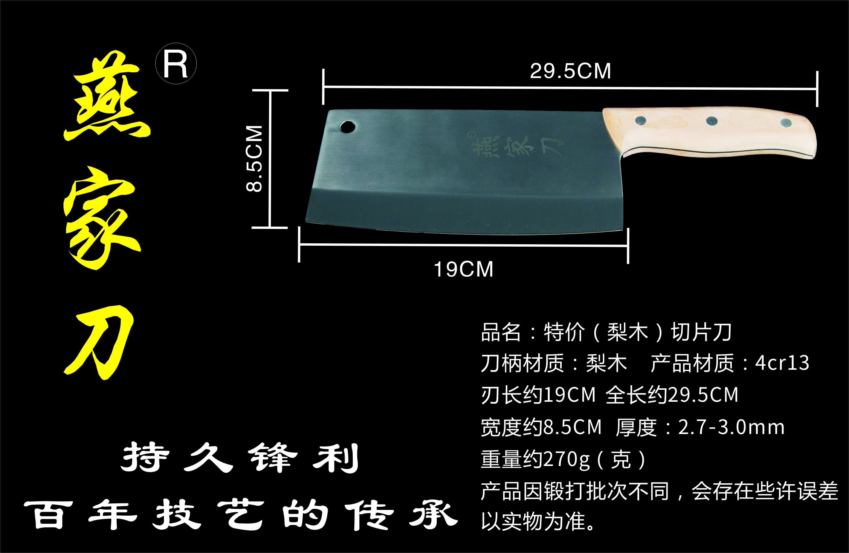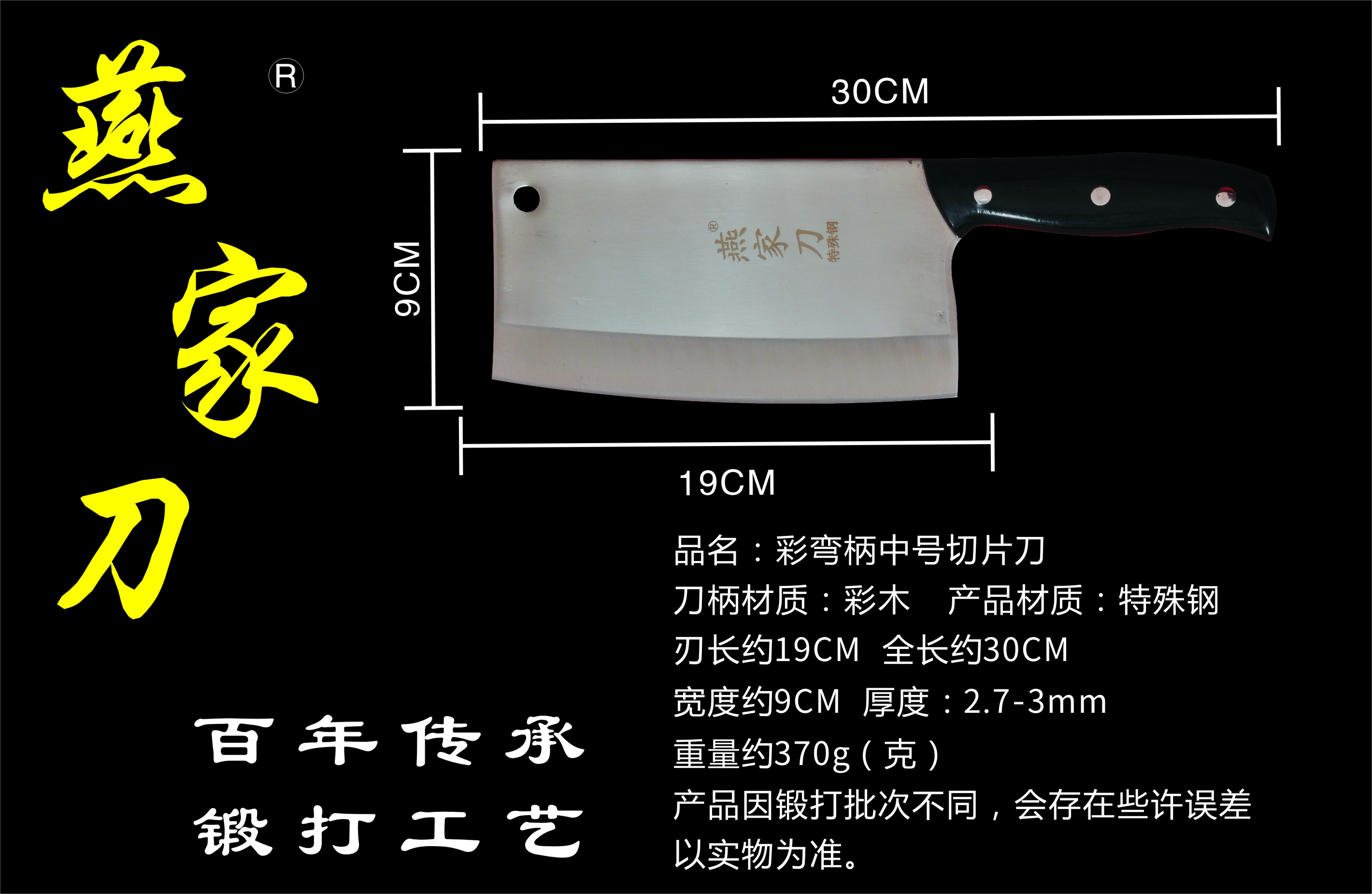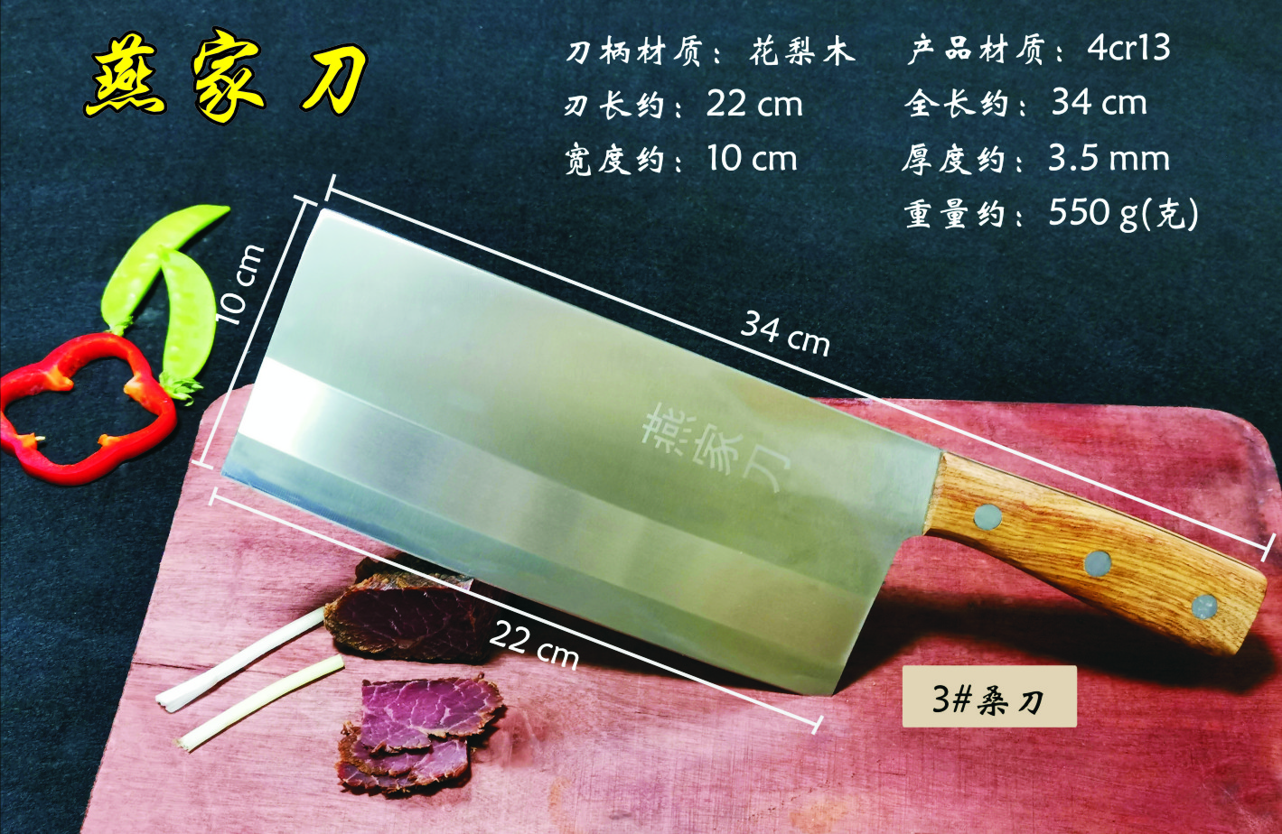 樂山燕家刀具有限公司(公司前身為燕佳鐵匠鋪),公司坐落于美麗的佛都之鄉(xiāng)樂山嘉州,在全國各地有上千家代理經(jīng)銷點(diǎn),公司專業(yè)銷售、設(shè)計、制作各類刀具。秉承一貫鍛造三精要求,即選料精、用料精、工藝精。所選材料全部產(chǎn)自滇東鐵礦優(yōu)產(chǎn)區(qū)。本品牌刀具堅(jiān)持千挑萬選為材,千錘百煉為刀的手工鍛造工藝宗旨。具有鋒利耐磨、持久耐用,用料上乘,硬度高、韌度強(qiáng)的特點(diǎn)!